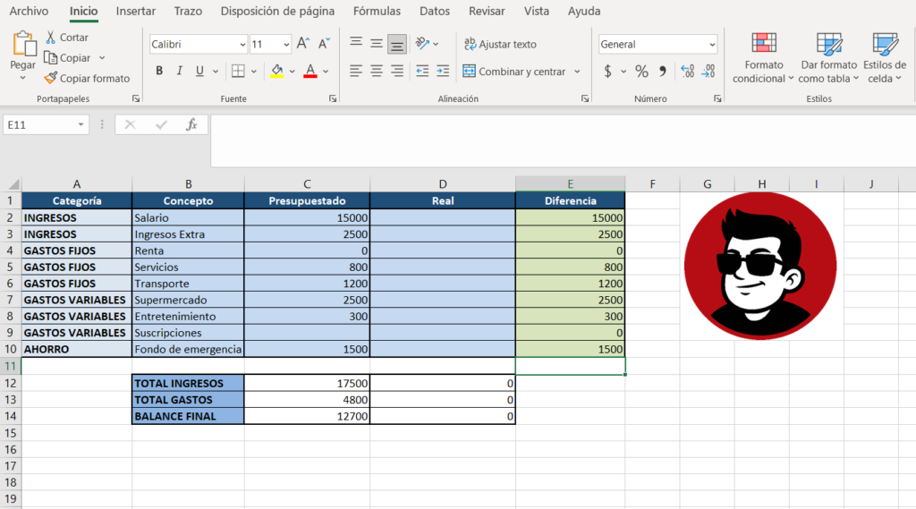 Solo necesitas llenar las columnas de “Presupuestado” y “Real”.